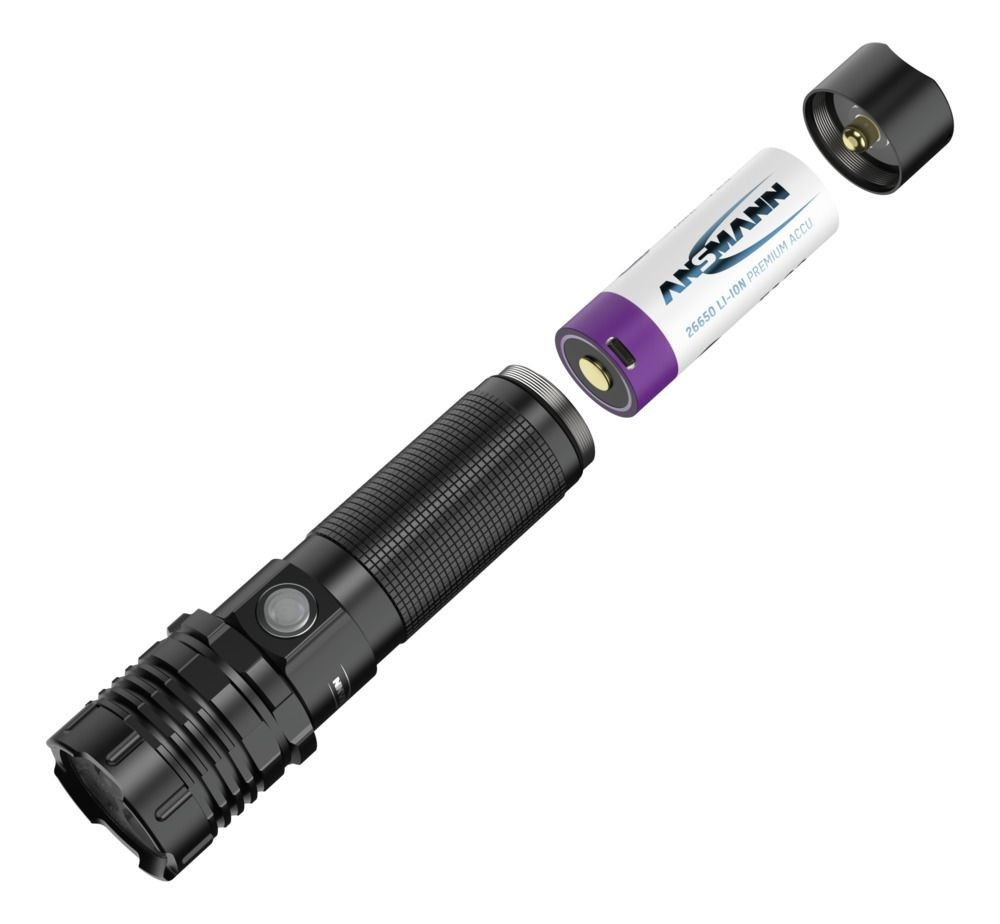 The 26650 lithium battery, equipped with ANSMANN safety technology, charges via an integrated Type-C connector. Compatible with all USB sources, you can easily recharge the light at home or on the go. A charging cable is included.