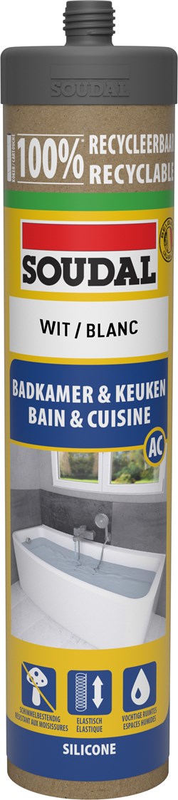 Bain & Cuisine AC est un mastic élastique à base de silicone. Ce mastic convient pour l’étanchéité des joints dans les espaces sanitaires (salle de bain) et les cuisines. Le mastic est conditionné dans une cartouche en carton compatible avec tous les pistolets à mastic. Après utilisation, l'emballage peut être démontée et recyclée.