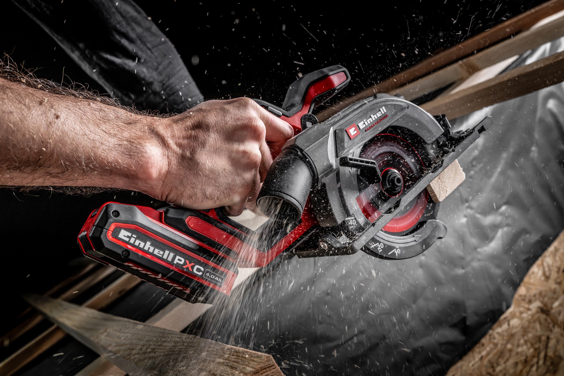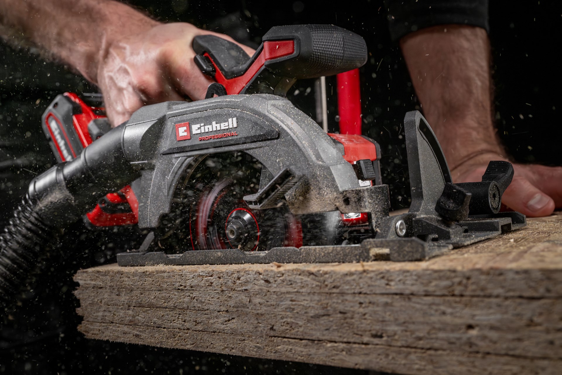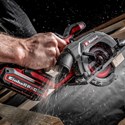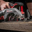La scie circulaire sans fil Einhell Professional TP-CS 18/136-C Li BL-Solo est un outil indispensable pour tous les professionnels et bricoleurs amateurs. Légère mais néanmoins puissante, cette scie circulaire portative sans fil est plus compacte que les modèles de puissance similaire, ce qui la rend extrêmement polyvalente et maniable à l’atelier ou au garage. L’appareil est entraîné par un moteur sans charbon Einhell. Ce moteur sans charbon offre davantage de puissance et une durée de fonctionnement plus longue que les moteurs à charbon classiques. Le moteur sans charbon est garanti 10 ans après son enregistrement en ligne. Avec sa profondeur de coupe maximale de 51 mm (à 90°), la lame de scie haute qualité TCT au diamètre de 136 mm scie sans peine le bois à l’aide de ses 16 dents. La lame de scie est incluse et se monte ou s’échange facilement grâce au blocage de la broche. L’angle de coupe (max. 48°) et la profondeur de coupe se règlent sans outils. Les aides à la coupe comme le ligneur bien visible, la butée parallèle, la table de sciage haut de gamme en aluminium et la LED lumineuse permettent des coupes précises et une bonne visibilité de la pièce à usiner. L’adaptateur pour aspirateur pivotant, allié à l’évacuation des copeaux, permet de conserver un espace de travail propre. Pour garantir la sécurité de l’utilisateur et de la machine, la scie circulaire portative sans fil Professional TP-CS 18/136-C Li BL est équipée d’un frein moteur électrique, d’une fonction de démarrage progressif et de surfaces en Softgrip. La scie circulaire compacte est compatible avec la gamme de rails de guidage Einhell. La scie est livrée sans batterie ni chargeur. Ces accessoires sont disponibles séparément, par ex. dans le Starter Kit pratique.