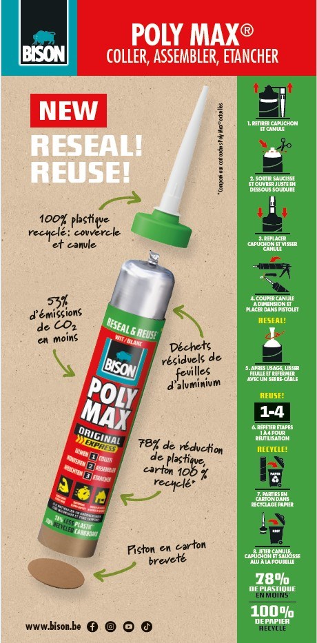 En 2026, Bison International, expert en adhésifs et mastics depuis plus de 85 ans, sera le premier sur le marché à introduire une nouvelle gamme de cartouches “saucisses” d’adhésif et de mastic polymère dans une cartouche en carton refermable et donc réutilisable.