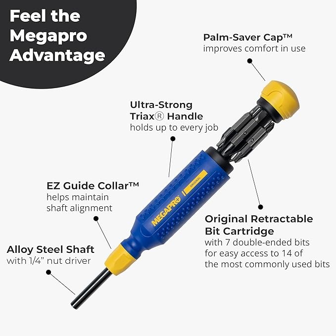 Met de Megapro multi-bit schroevendraaier heb jij geen uitgebreide schroevendraaierset meer nodig, want je krijgt 15 verschillende schroevendraaiers in 1. Dankzij de uittrekbare bithouder hoef je niet meer naar bitjes te zoeken en raak je ze niet meer steeds kwijt. De bitjes heb je altijd binnen handbereik en zijn netjes opgeborgen. Dankzij de meer dan 25 jaar gepatenteerde technologie doe je klussen met de Megapro multi-bit schroevendraaier in een handomdraai.